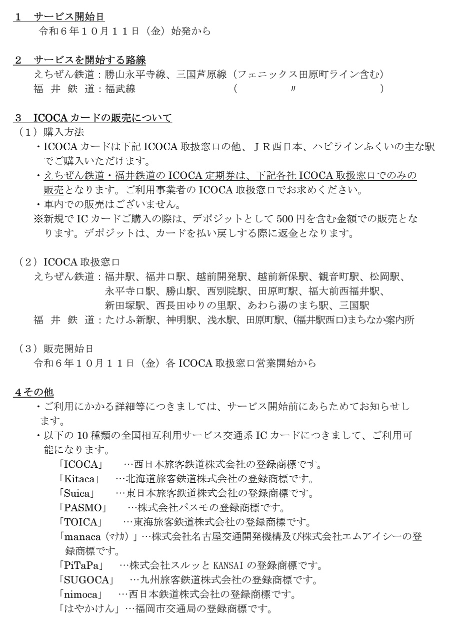 福鉄電車では、交通系ICカード「ICOCA」を導入し、2024年10月11日(金)より利用を開始します。