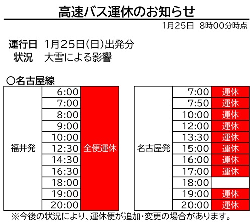 ●大雪による高速道路規制の影響のため、1月25日(日)の名古屋線に運休便が出ています。お客様にはご迷惑をおかけいたします。