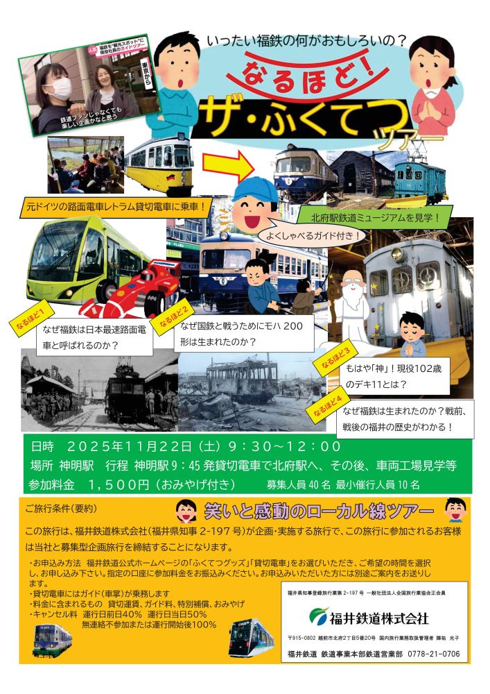 申込方法 グッズ販売ページより「貸切電車」「なるほど!ザ・ふくてつツアー」を選んでいただき、「カートに入れる」から必要事項を入力してください。 最大3名様まで入力出来ます。詳細な開催内容等については、メール等にてご案内をお送りいたします。お電話でも受付も可能です。申込先 TEL 0778-21-0706まで(平日8:15~17:00)、お電話でお申込みの場合は、鉄道営業部 0778-21-0706 までお願いいたします(平日9時~17時)