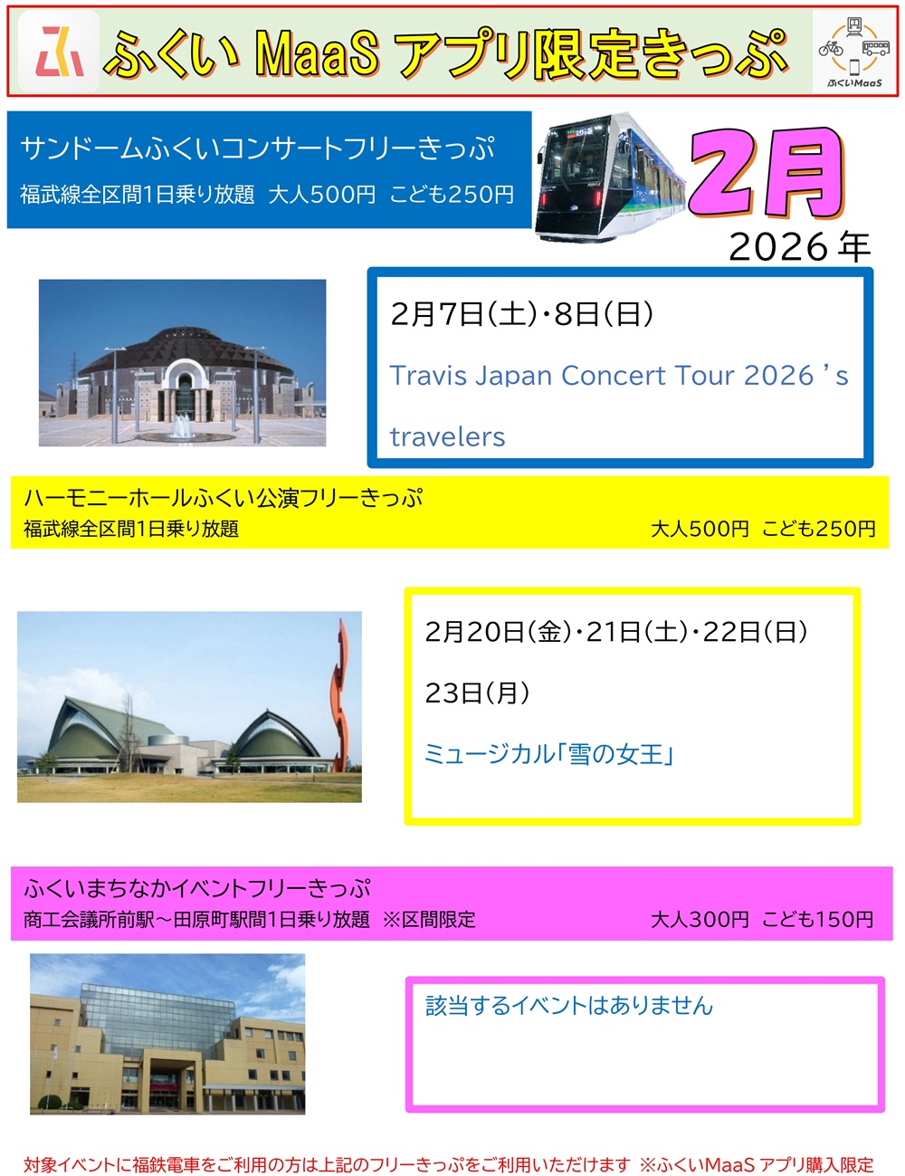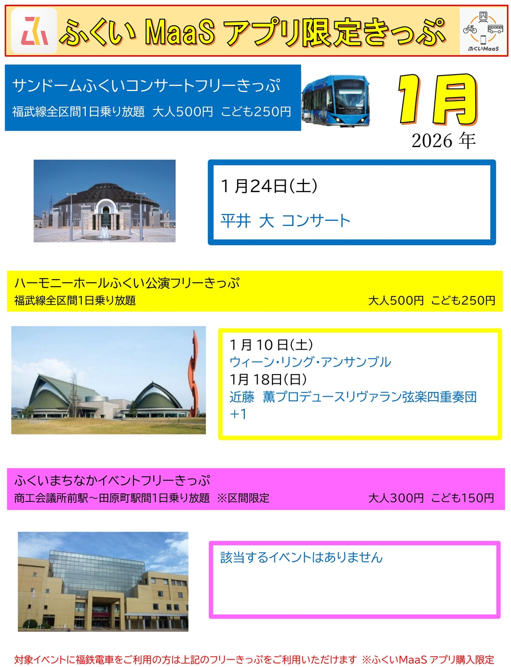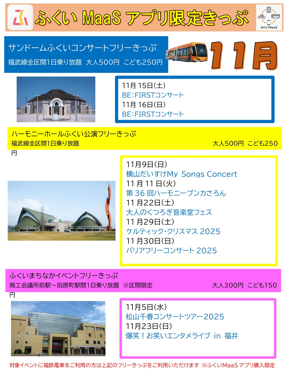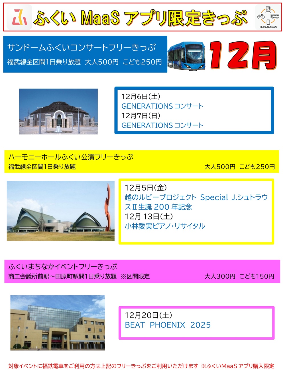 イベントへのお出かけに便利でお得なフリー乗車券を、「ふくアプリ」内のふくいMaaSデジタルチケットとして発売します。
