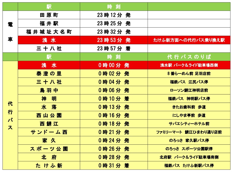 三十八社~たけふ新間運休、浅水~たけふ新間で代行バスを運行します。