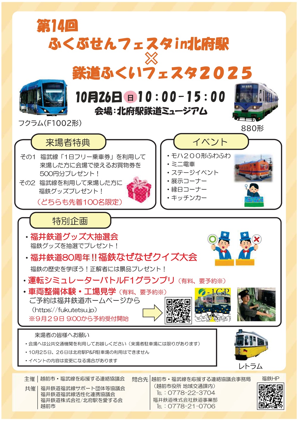 抽選会やクイズ大会、電車の工場見学、ふくてつグッズの販売など様々な企画をご用意しております。