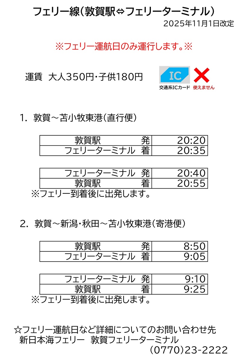 福鉄バスでは、2025年11月1日(土)にフェリー線(敦賀駅~フェリーターミナル)の