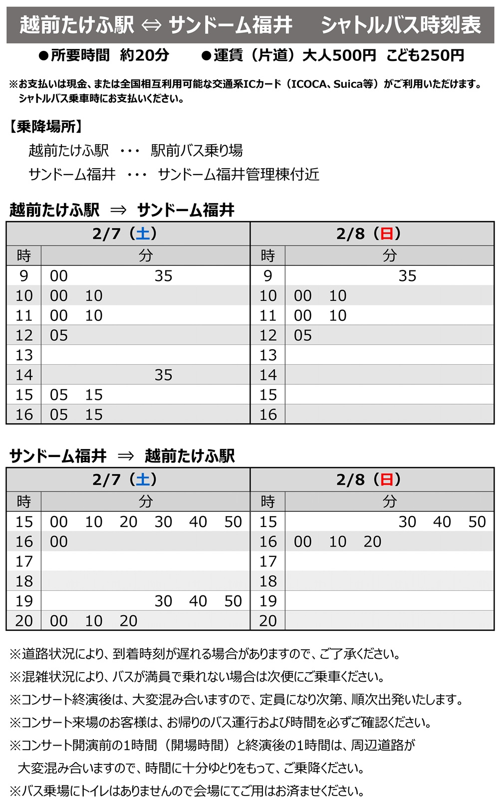 HOME > お知らせ > 越前たけふ駅⇔サンドーム福井 シャトルバス運行のお知らせ(2月7日・8日)