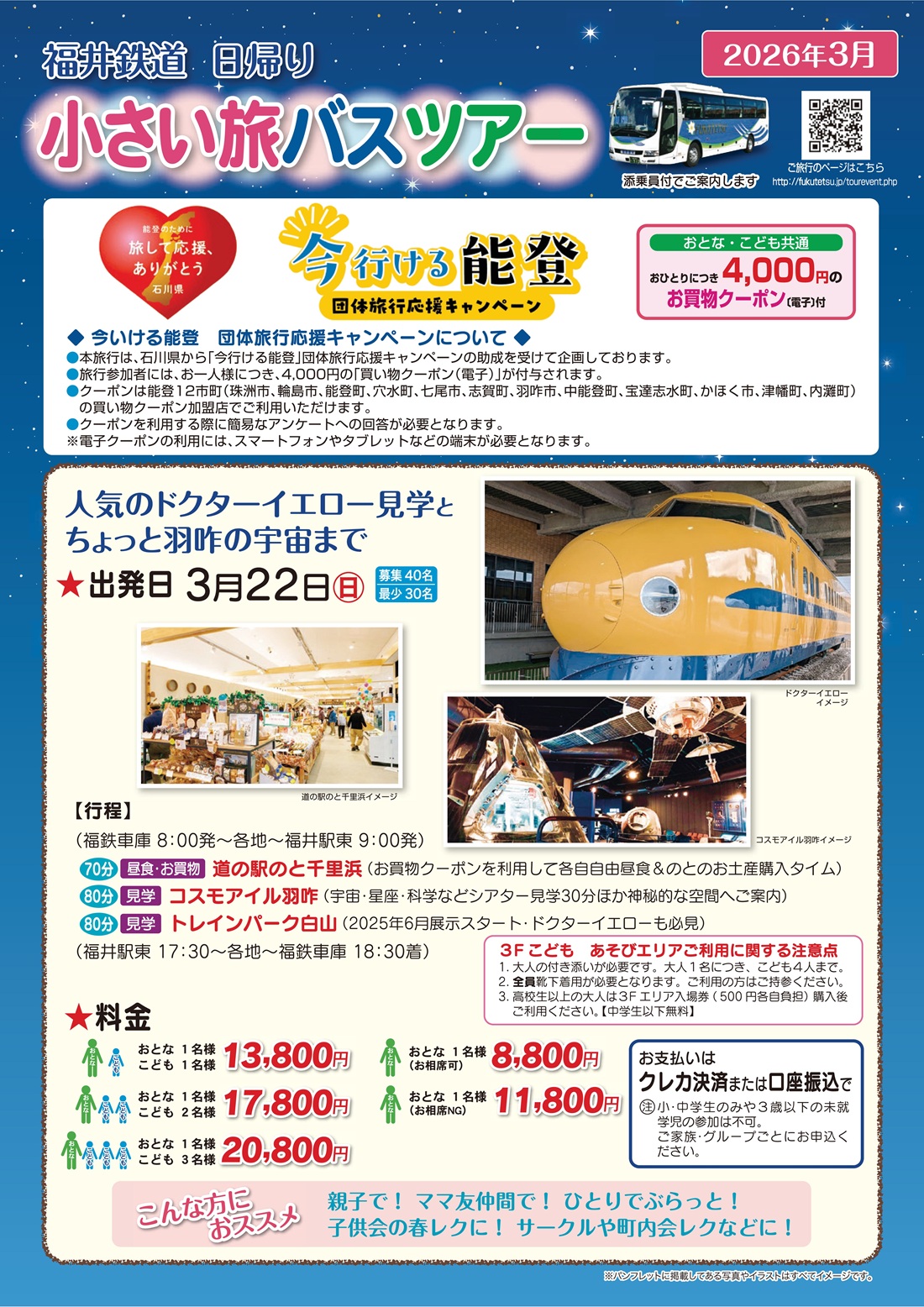 〈バス旅行〉「人気のドクターイエロー見学とちょっと羽咋の宇宙まで」を発売します(3月22日)いつも福鉄バスをご利用いただき、ありがとうございます。