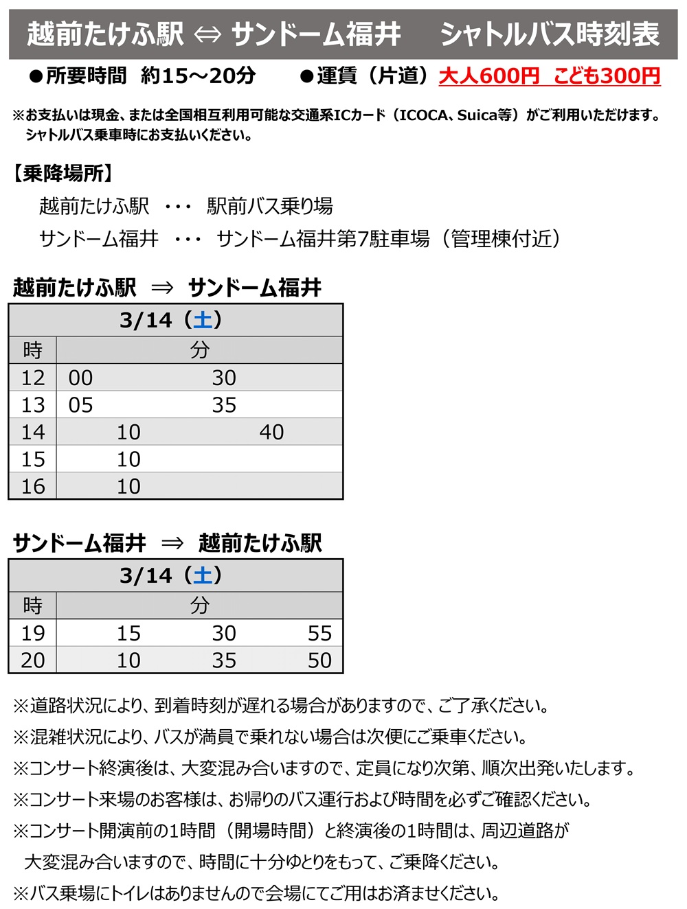 HOME > お知らせ > 越前たけふ駅⇔サンドーム福井 シャトルバス運行のお知らせ(3月14日)