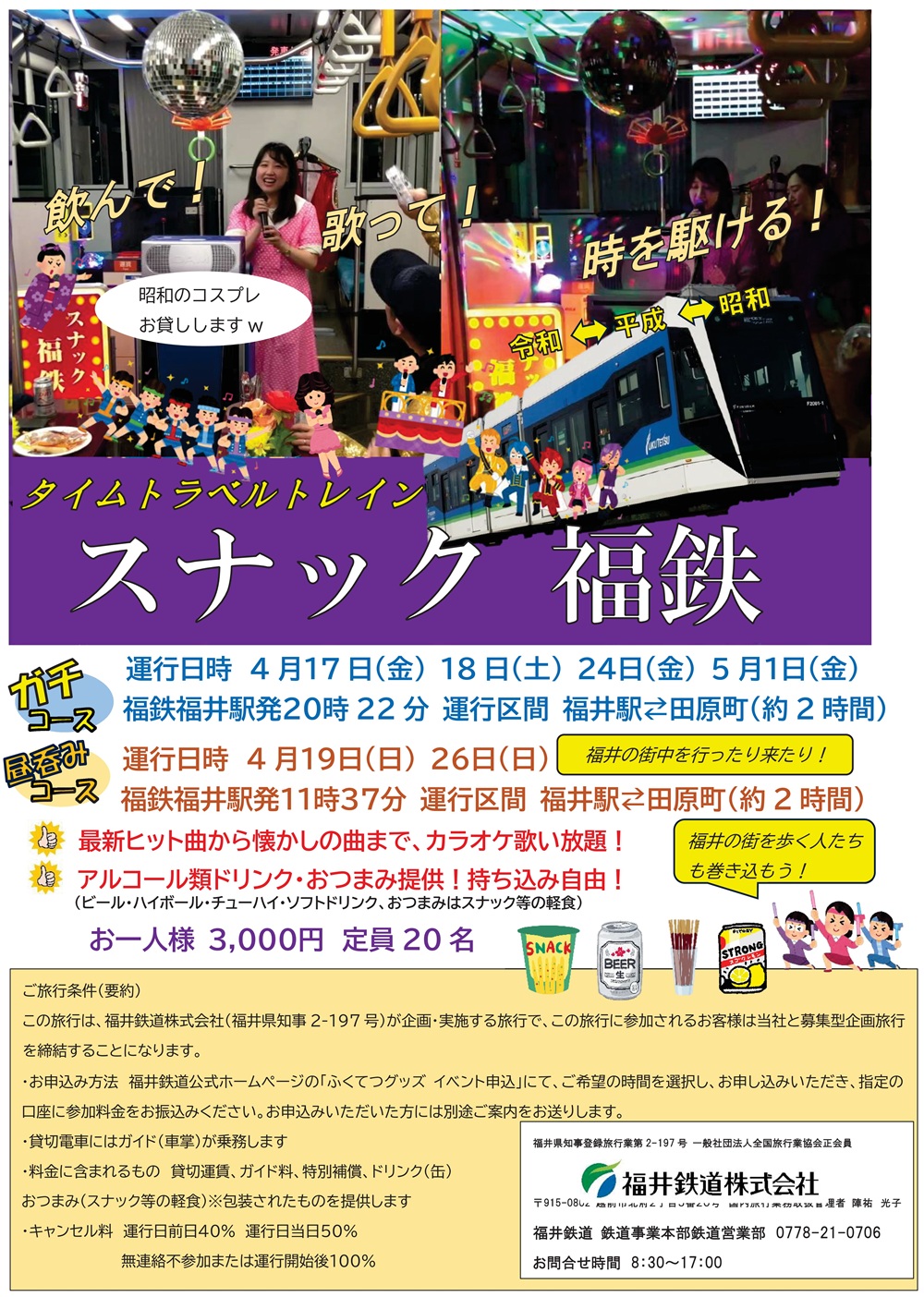 福鉄電車では、2026年4月~5月に「タイムトラベルトレイン スナック福鉄」を運行します。