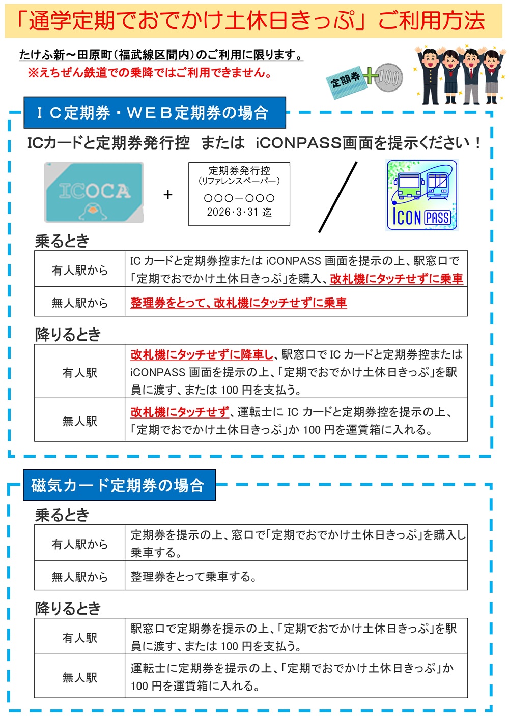 ●福鉄電車の通学定期券をお持ちの方が、土休日に通学定期券の区間外を乗車する場合、福武線内を片道100円でご乗車いただけます。