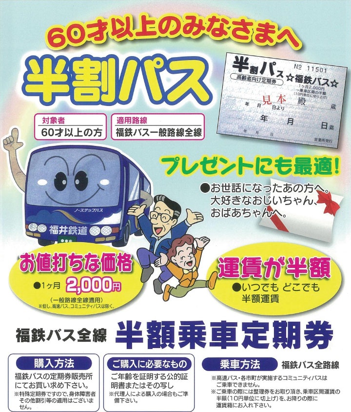 60歳以上のみなさまに、福鉄バス全線半額乗車定期券。いつでもどこでも半額運賃!おじいちゃん、おばあちゃんへのプレゼントに!
